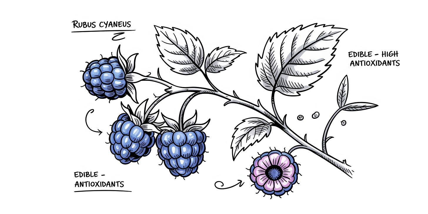 It was loosely inspired by a dark raspberry variety called whitebark raspberry, or Rubus leucodermis. That fruit grows in North America from Alaska down to Mexico. When ripe, it’s a dark purple, almost black, with a whitish bloom on the surface that gives it the name whitebark. If you squeeze the juice, it’s purple. Not blue. But the flavor is supposed to be similar to a red raspberry, just a little more tart.